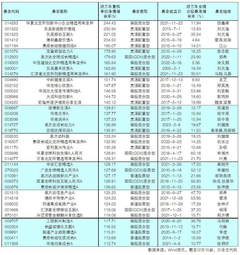 “新指引”更强化了长期业绩的要求。记者根据Wind资讯发现,截至2025年12月15日,最近三年一共有5186只基金跑赢基准且净值增长率为正(只考虑主代码),其中,华夏北交所创新中小企业精选两年定开的业绩最高,达到244.43%。主动权益类基金中富农优配资源,东吴新趋势价值线、东吴移动互联A、德邦鑫星价值A近三年的业绩也都超过了200%。此外,景顺长城稳健回报A、宝盈转型动力A、易方达全球成长精选A、中信建投北交所精选两年定开A、东吴嘉禾优势A、汇添富北交所创新精选两年定开A、中邮健康文娱A近三年的业绩均超过150%,可以说,跟着这些基金,持有人或能获得不俗的收益(见表)。