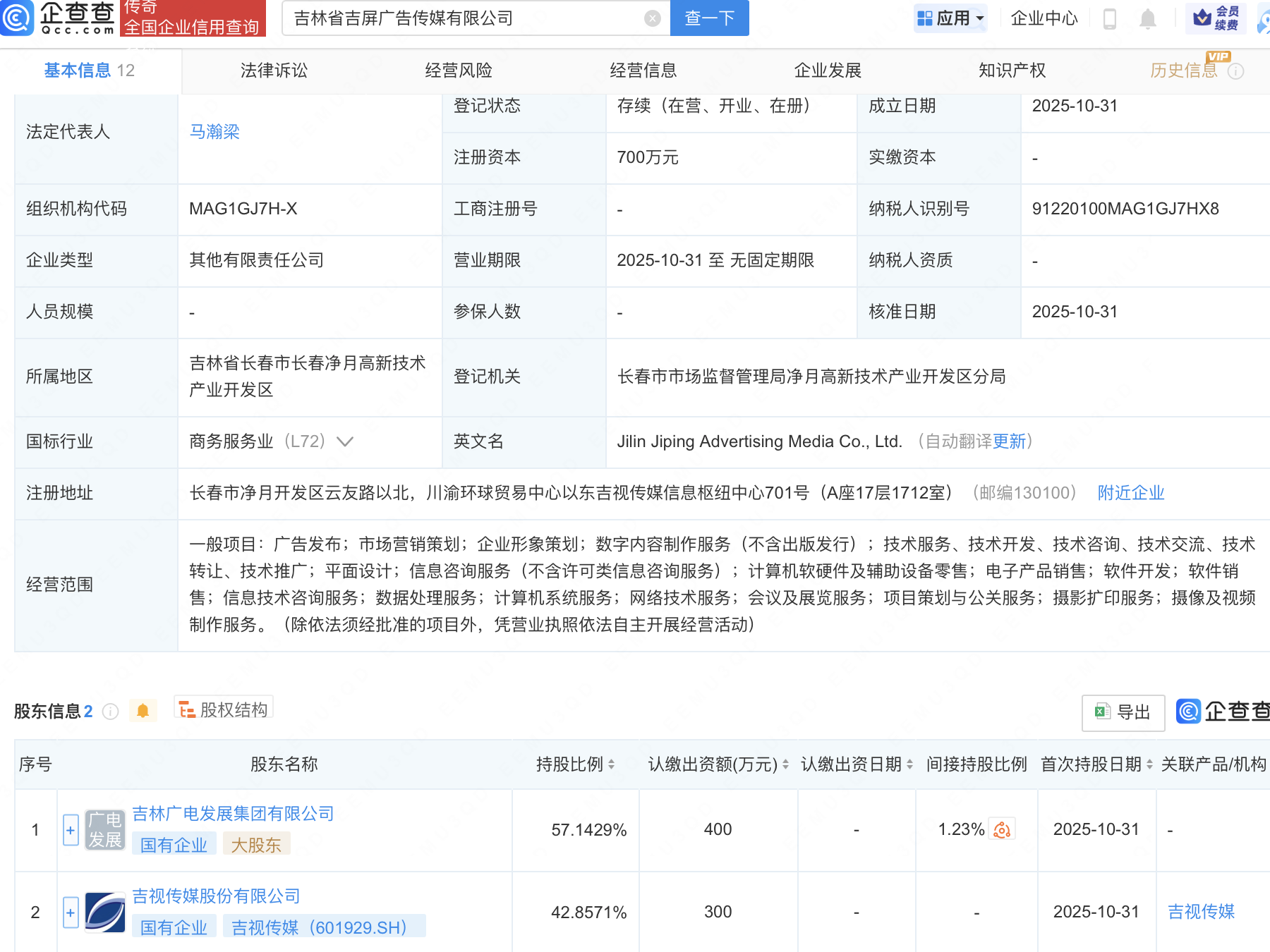 近日,吉林省吉屏广告传媒有限公司成立,经营范围包含:计算机软硬件及辅助设备零售;电子产品销售;软件开发;软件销售等。企查查股权穿透显示,该公司由吉视传媒(601929)等共同持股。
